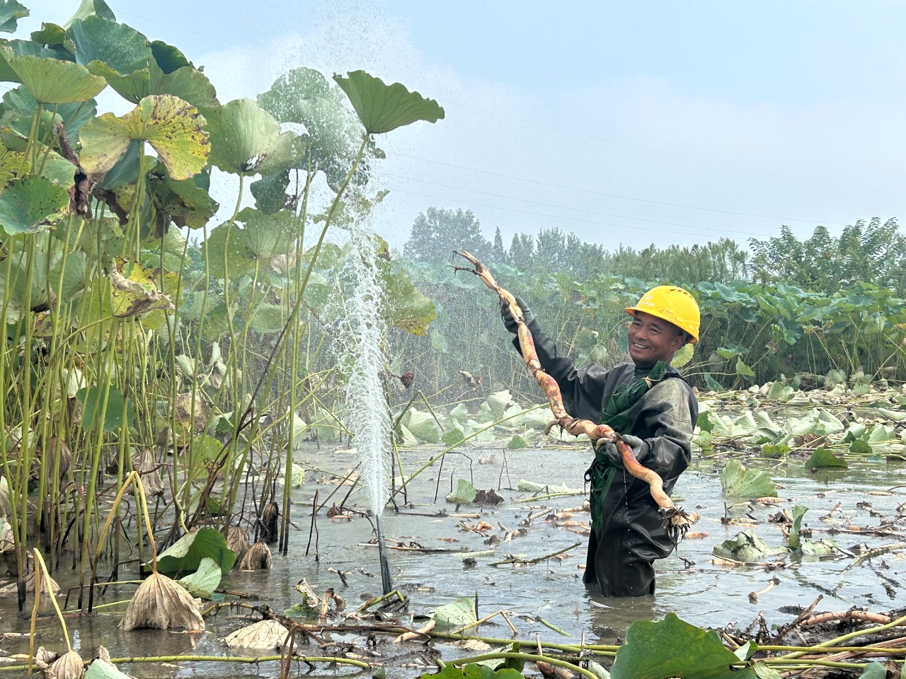 潜江新闻网讯(潜江市融媒体中心记者 王宇杰 摄)9月中旬以来,王场镇王场村200亩藕塘迎来采收季。挖藕人身着防水服,手持高压水枪在藕田中忙碌作业,日均采收2000多斤莲藕,销售额达1.2万余元。挖藕人手捧饱满的莲藕喜笑颜开,脸上写满丰收的喜悦。这批优质莲藕通过冷链物流发往武汉、广东等地,成为带动当地农民增收的“致富藕”。