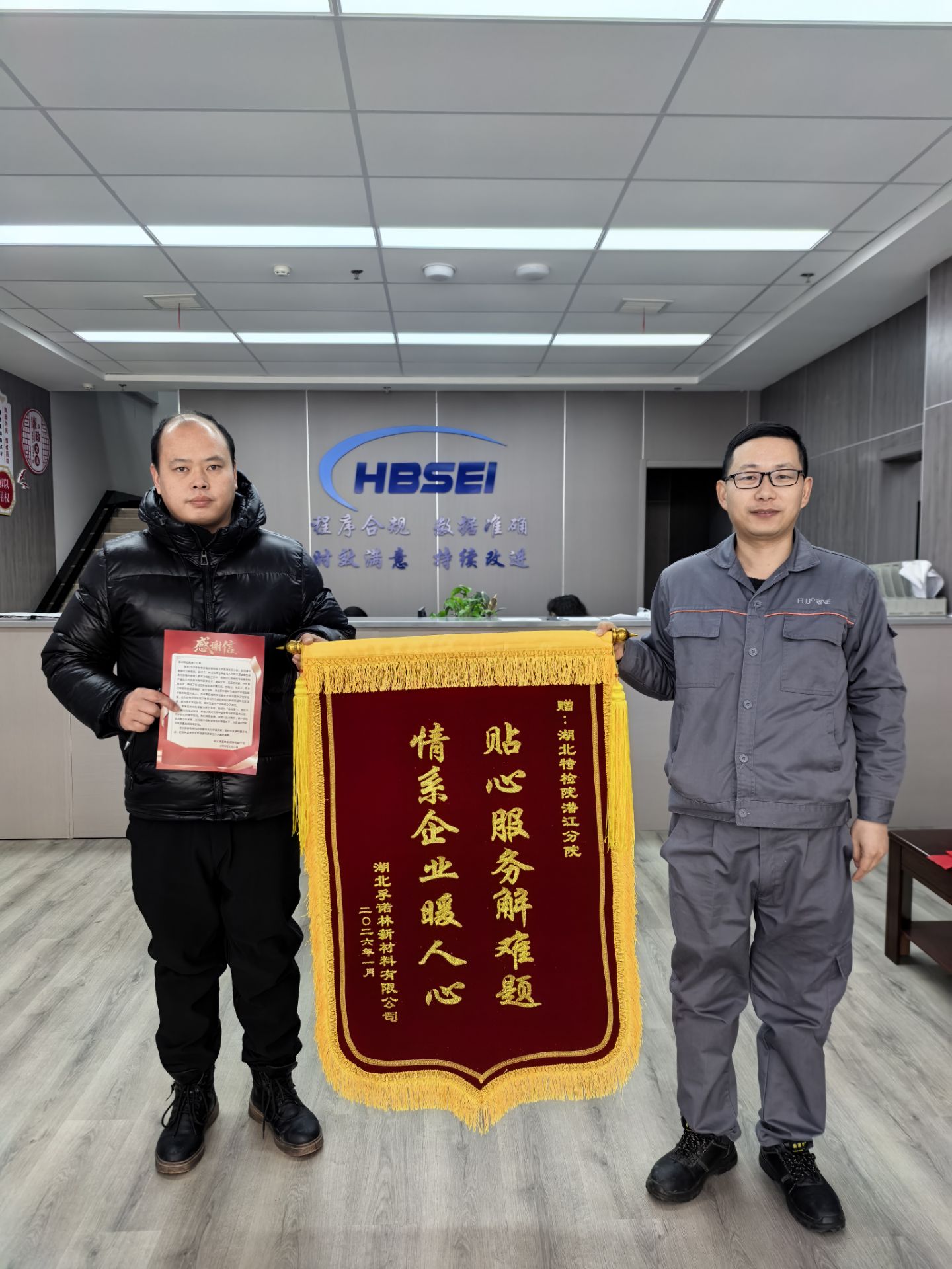 潜江新闻网讯(潜江市融媒体中心记者 杨靖 通讯员 伍颖)近日,湖北孚诺林新材料有限公司代表专程来到湖北特种设备检验检测研究院潜江分院,将一面印着“贴心服务解难题 情系企业暖人心”的锦旗和感谢信送到该院