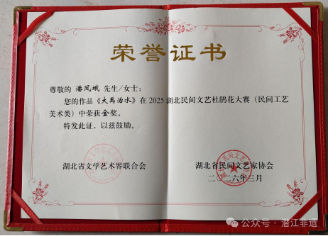 近日,2025年湖北民间文艺杜鹃花大赛(民间工艺美术类)评选结果在鄂州园博园揭晓,潜江省级非物质文化遗产 “面花(潜江面塑)” 代表性传承人潘凤娥创作的面塑作品《大禹治水》,从全省 159 位艺术家的 246 件参赛作品中脱颖而出,荣获湖北杜鹃花大赛金奖,为荆楚民间工艺再添光彩。