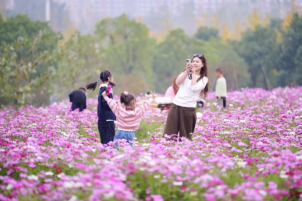 10月30日,泰丰街道太丰垸社区七组,成片的格桑花与百日菊交织成近千平方米的彩色“花毯”,粉白的花瓣在秋风中轻颤,吸引了不少市民驻足拍照。